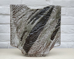 2025Opgebouwd vanuit kleiplaten met textuur. Steengoed (zoutstook in reductie) en vervolgens lage stook in oxidatie.