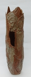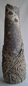 2008Vaasvorm gemaakt van lappen lichte klei met applicatie van donkere klei. Steengoed, ongeglazuurd - Te zien bij Galerie Kunststukken 101, Thomsonlaan 101, Den Haag (http://www.kunststukken101.nl)